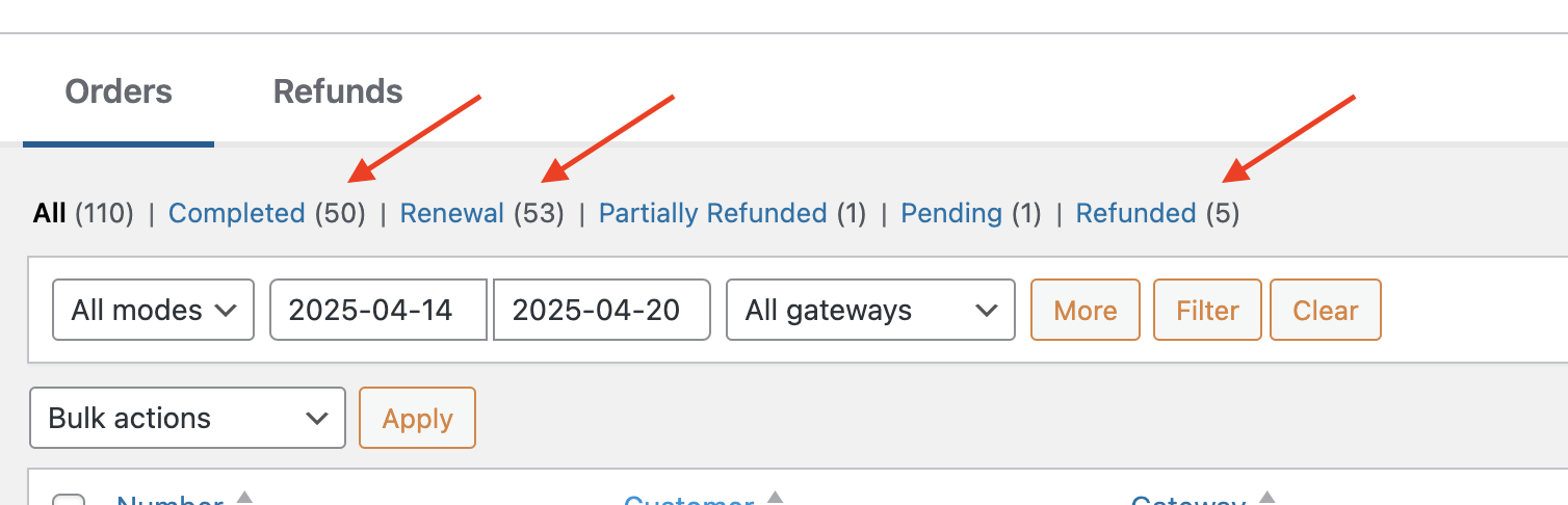 Completed = New sales, Renewal = Renewals, Refunded = Refunds