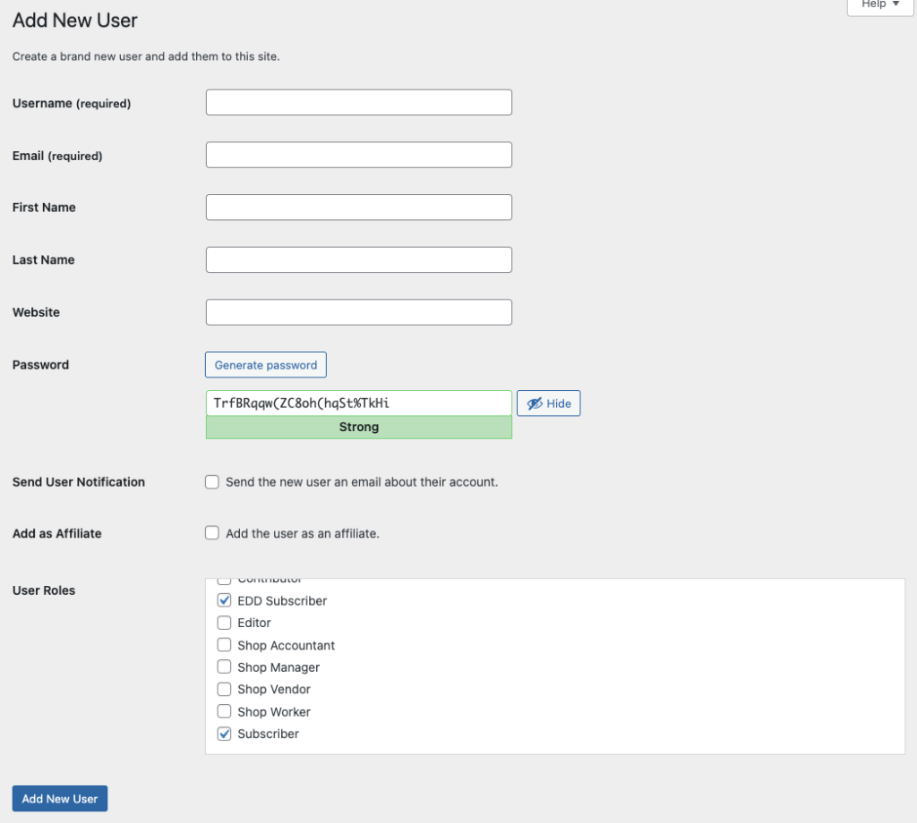 Create user. User > Add New