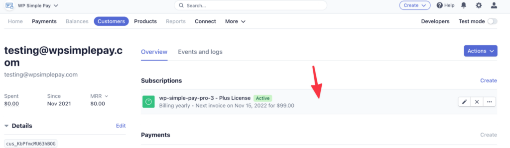 Once you’ve created the subscription, you will be returned to the customer screen. Here, click into the newly created subscription