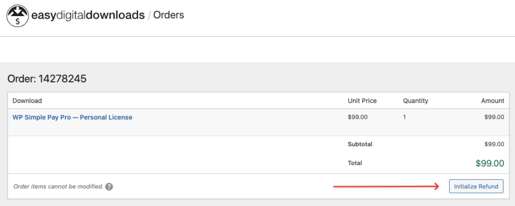 - This will open the Order page in EDD. In the Download section of the page, click the Initialize Refund button. This will open a modal window.