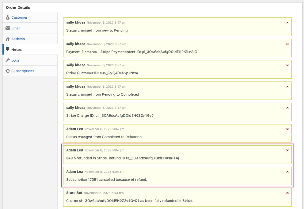 - Scroll down to the Order Details section and click the Notes tab. Check that there’s a Refund ID noted (similar will appear for both Stripe and PayPal). Sometimes, this same line of text appears twice, and that’s fine.